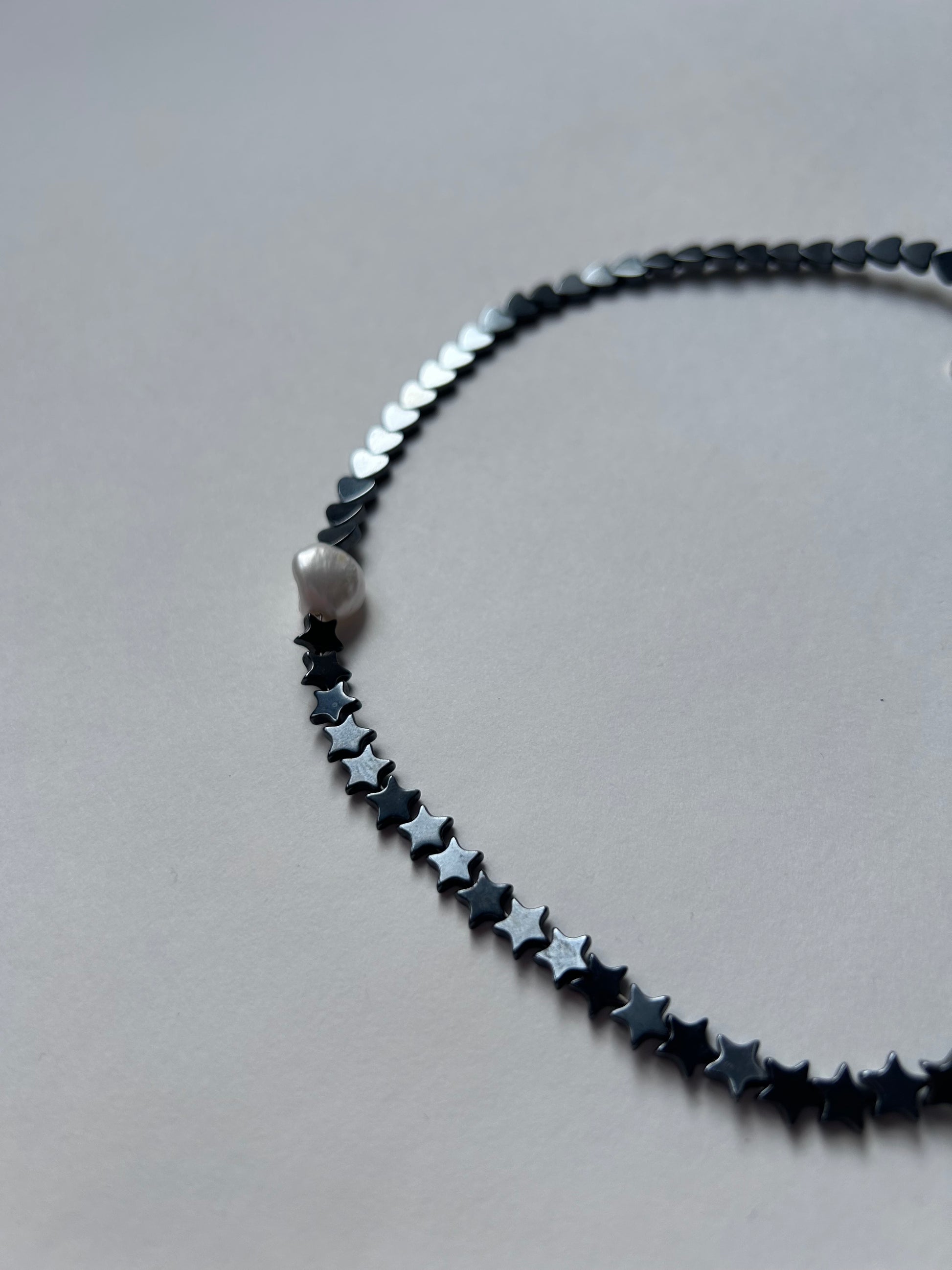 Collar de hematita en forma de corazones y estrellas, con perla cultivada de agua dulce. Fornituras de plata de ley. Cierre de mosquetón con alargador. Hecho a mano en España.