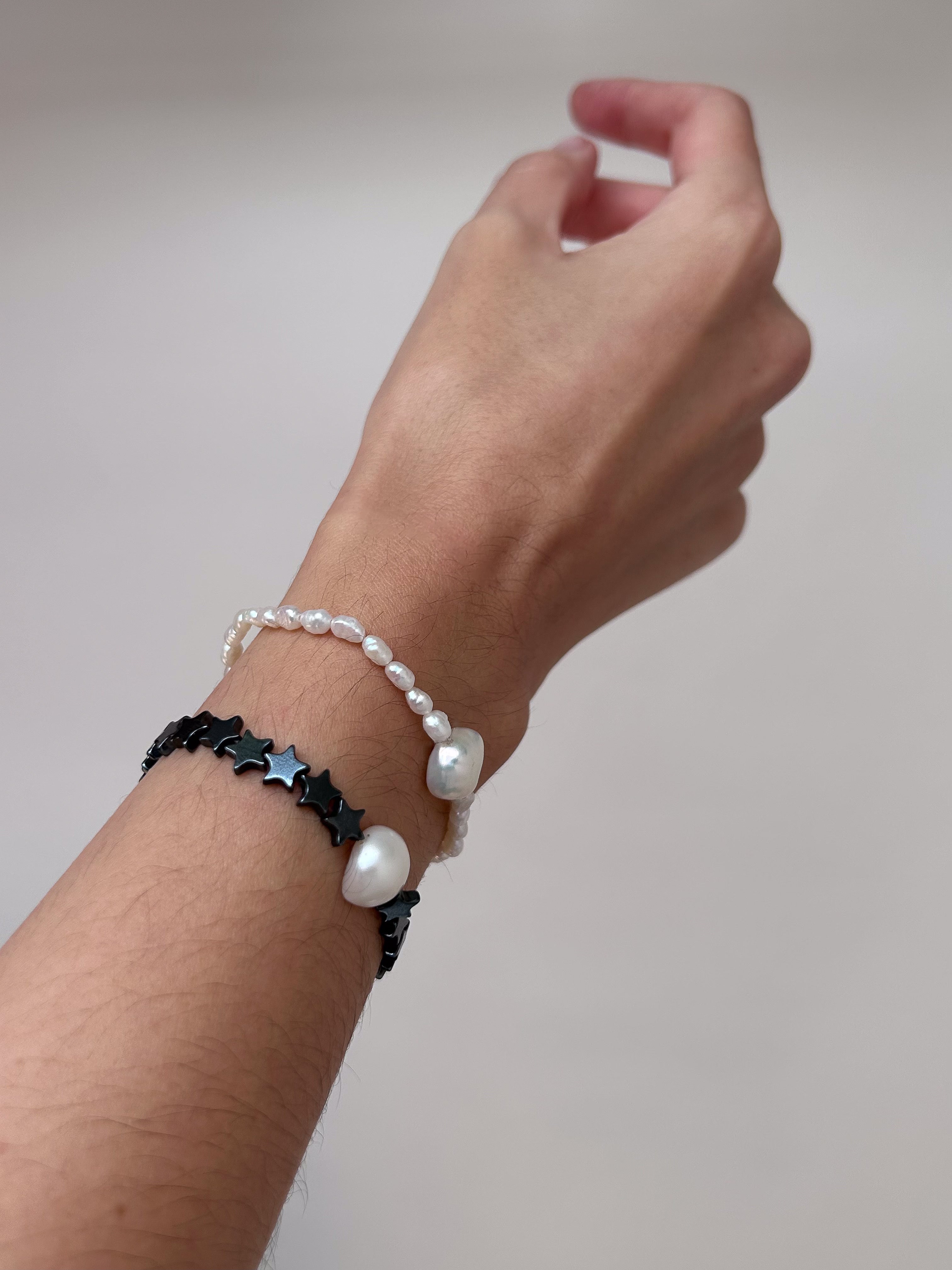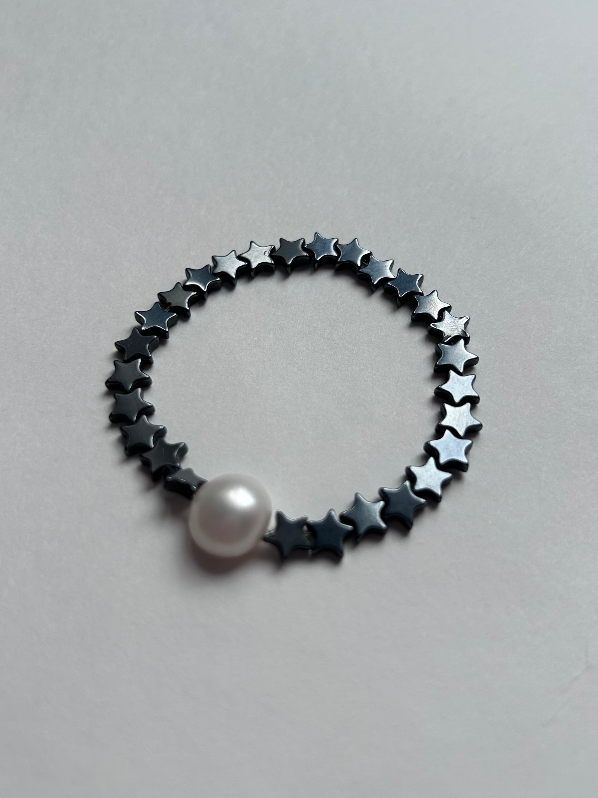 Pulsera elástica de hematitas con forma de estrella y perla barroca de agua dulce. Hecha a mano en España.